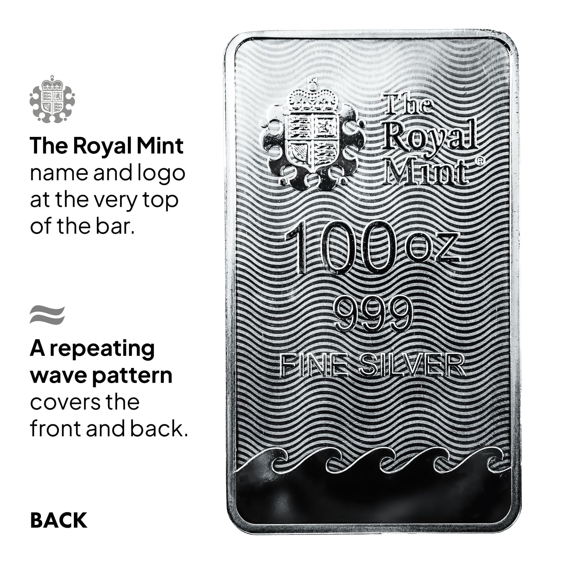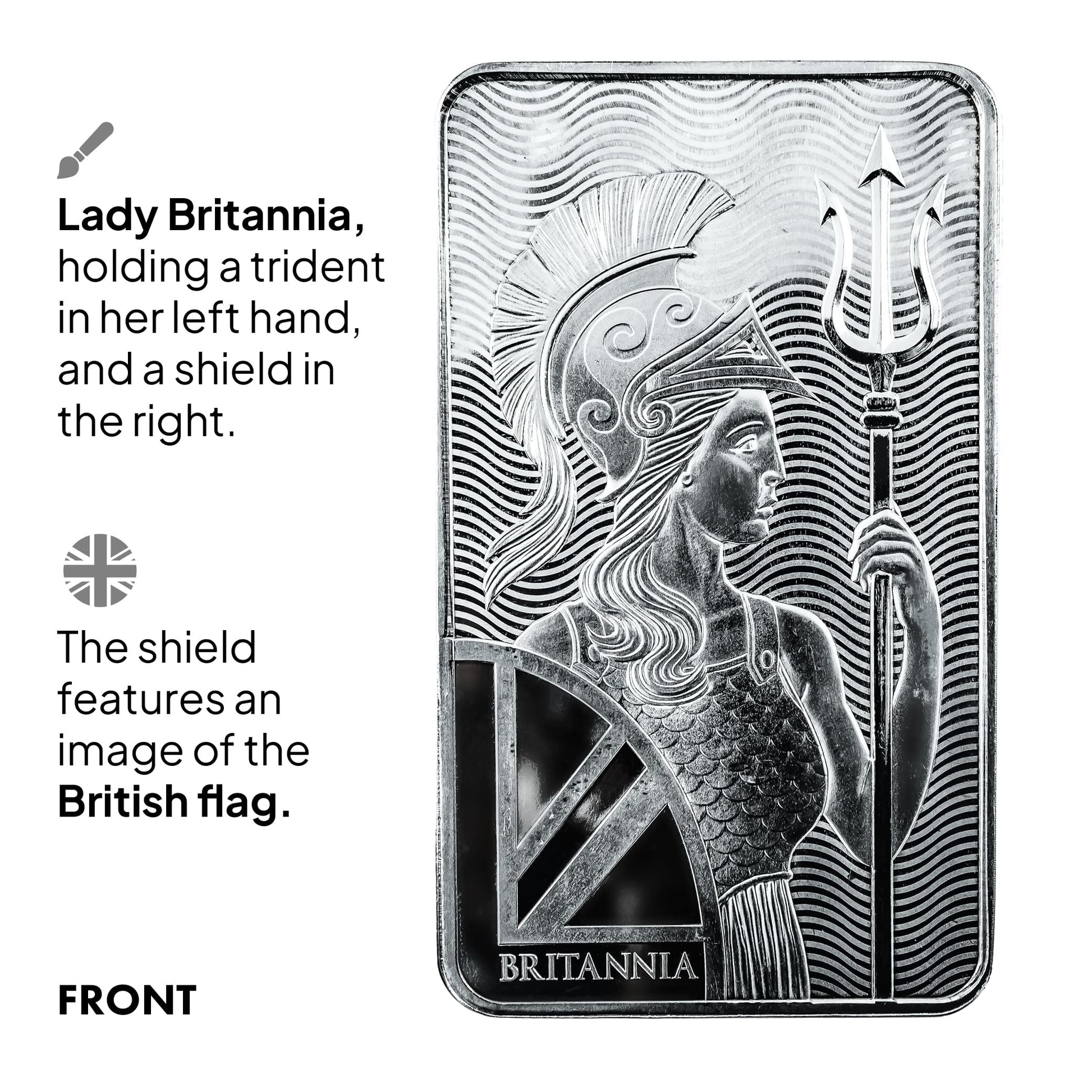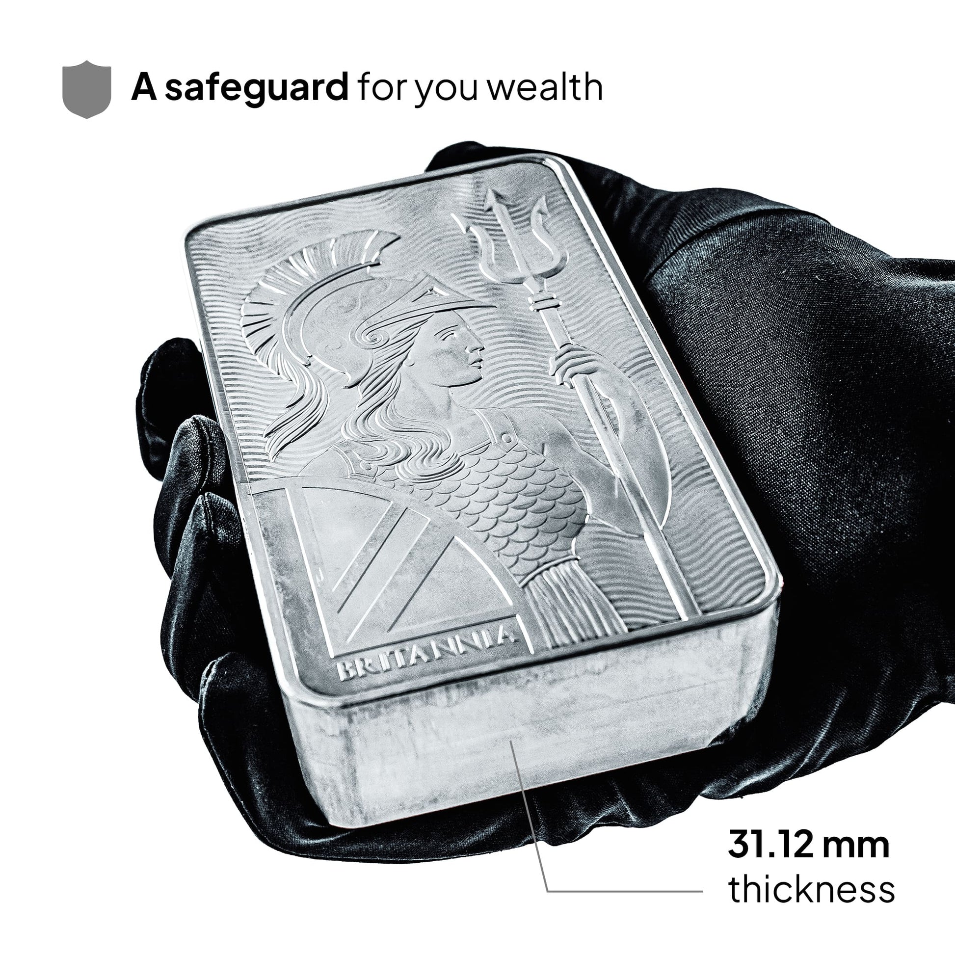 Introducing the Britannia 100oz Silver Bars from the prestigious Royal Mint. Immerse yourself in the elegance and purity of Britannia silver. These meticulously crafted bars combine timeless beauty and exceptional quality.