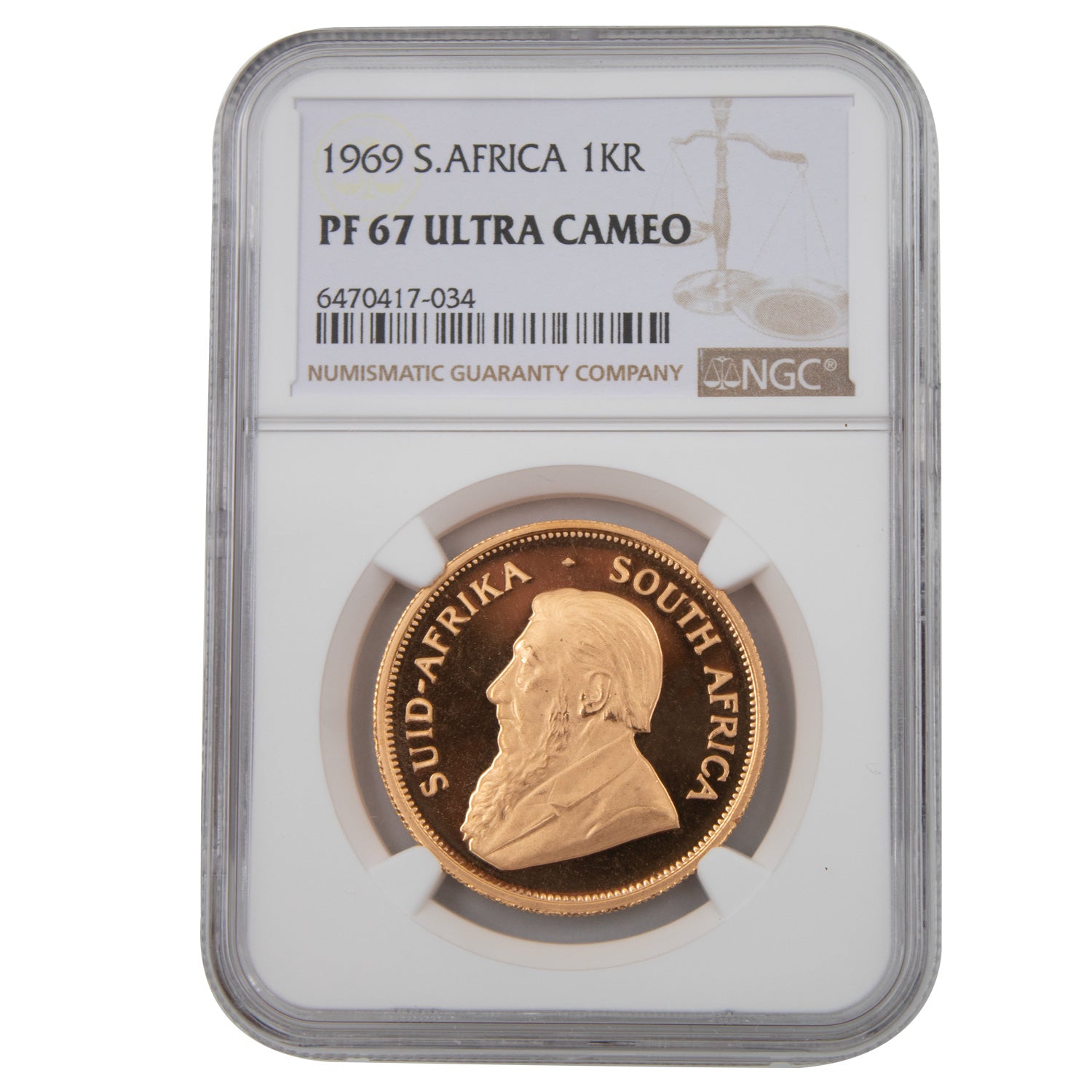 Own a rare and exceptional piece of numismatic history with the 1969 1oz Proof Krugerrand, graded PF67 Ultra Cameo (UCAM) by NGC. As one of the finest examples of the early Krugerrands, this coin exemplifies exceptional craftsmanship and historical significance.