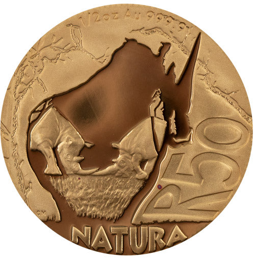2010 1/2oz Gold Black Rhino Coin: Struck by the South African Mint, this coin features the iconic Black Rhino and is part of the Natura series. Content: 999.9 Gold. Weight: 15.553gram (24ct). Diameter: 27.00mm